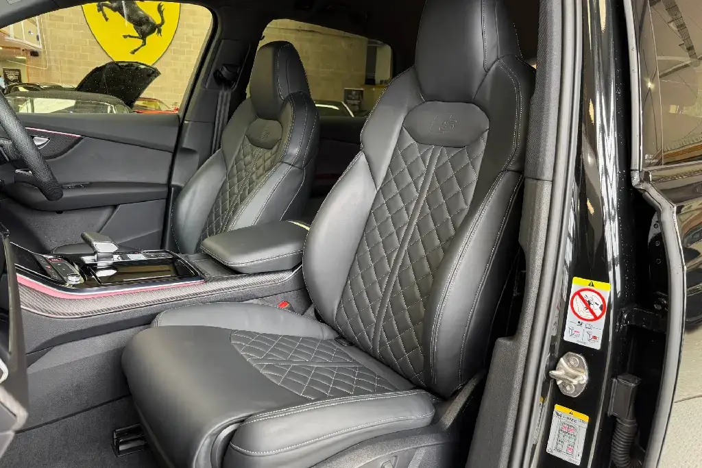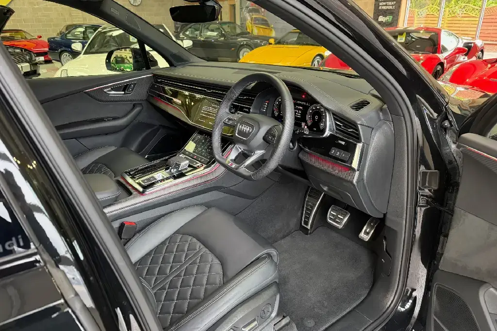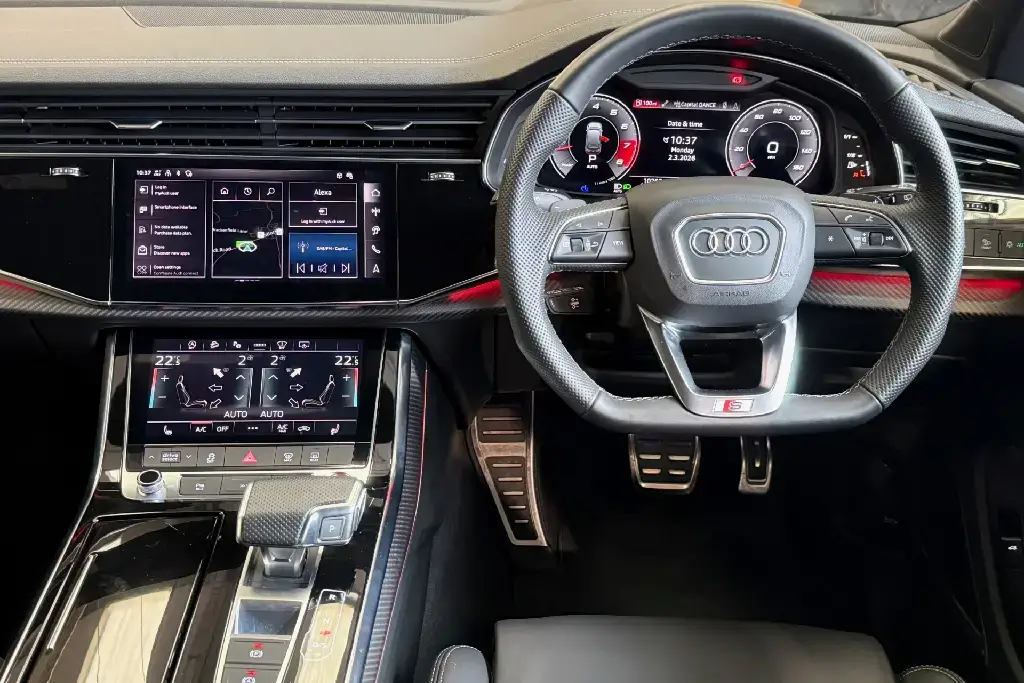 Features Include – 22″ Alloys – Black/Machined, Red Calipers, Bang & Olufsen Sound, Heads-Up-Display, Apple CarPlay, Standard Features – 2 USB-C Ports with Charging Functionality in the Rear, 3-Spoke Flat Bottomed Leather – Multifunction Sport Steering Wheel, 4-Way Lumbar Support for Front Seats, 7 Seats, All-Wheel Steering, Anti-Theft Alarm with Tow-Away Protection, Anti-Theft Wheel Bolts and Wheel Loosening Warning, Audi Beam, Audi Connect with Amazon Alexa Integration, Audi Drive Select, Audi Pre-Sense Front, Audi Smartphone Interface, Audi Virtual Cockpit Plus, Auto Dimming and Frameless Rear View Mirror, Black Styling Package Plus, Camera-Based Traffic Sign Recognition, Comfort Front Centre Armrest, Cruise Control with Speed Limiter, DAB Digital Radio, Deluxe Four-Zone Automatic Climate Control, Door Mirrors – Anthracite Black, Door Mirrors – Heated – Electrically Adjustable – Folding and Auto Dimming with Memory Function, ESC – Electronic Stabilisation Control inc ABS – ASR and EDL, Electric Windows – Front and Rear, Electromechanical Parking Brake, Electromechanical Power Steering, Extended Pedestrian Protection Measures, First Aid Kit and Warning Triangle, Front Sun Visors with Illuminated Vanity Mirrors, Front and Rear Floor Mats, Fuel Tank 85L, Heated Front Seats, Hold Assist, ISOFIX Child Seat Mounting for Front Passenger, Illuminated Door Sill Trims with S Logo, Inlays – Polished Oak with Grey Finish, Keyless Go with Remote Central Locking, LED Daytime Running Lights, LED Rear Lights Plus, Lane Departure Warning, Loading Edge Protection in Stainless Steel, Luggage Compartment Cover, Luggage Compartment Sill Protection in Stainless Steel, MMI Navigation Plus with MMI Touch, Matrix LED Headlights with Dynamic Front and Rear Indicators, Multi-Coloured Extended LED Interior Light Pack, Natural Voice Recognition, Operating Buttons in Matte Black, Park Assist with Parking Aid Plus, Pedals in Stainless Steel, Power Operated Tailgate, Privacy Glass, Quattro with Self-Locking Centre Differential, S Line Badges on the Front Wings, S Line Bumpers in Full Body-Colour Paint Finish, S Line Roof Spoiler, S Line Styling Side Ventilation Grille and Side Skirts, S Specific Adaptive Air Sport Suspension, Seat Belt Monitoring, Technology Pack, Tool Kit, Tyre Pressure Loss Indicator, Tyre Repair Kit, Upper Interior Element with Contrast Stitching, Windshield with Heat Insulated Glass.