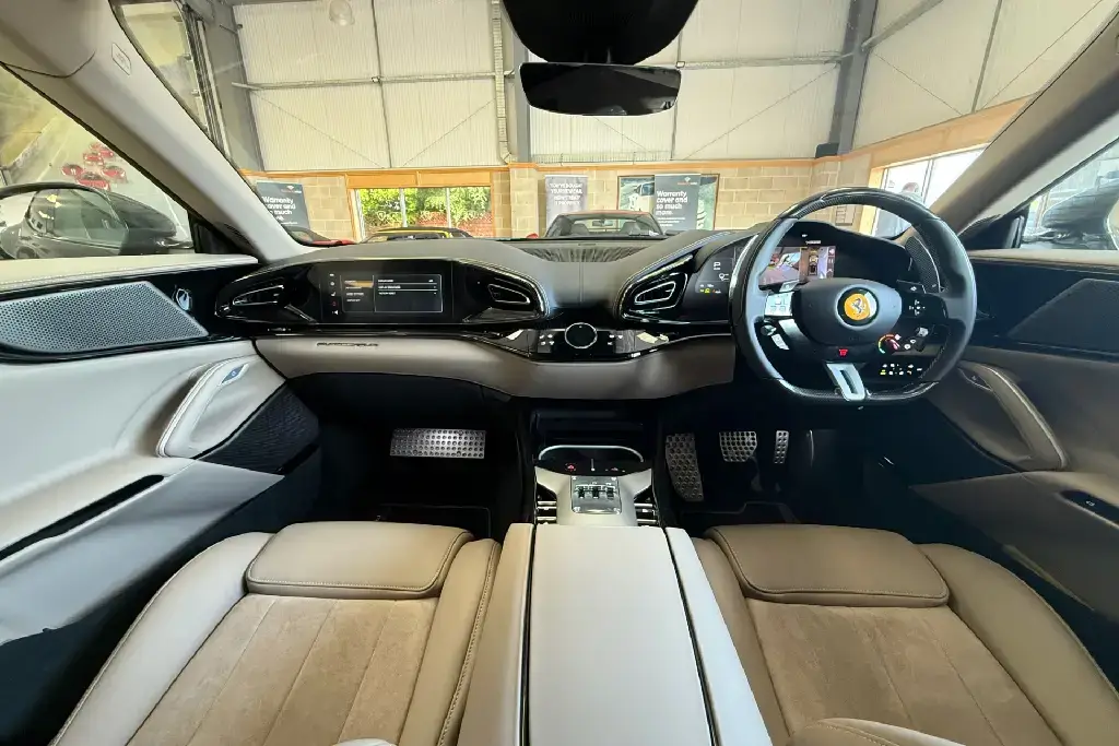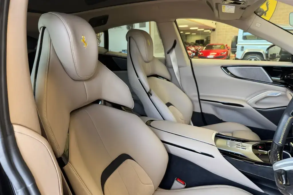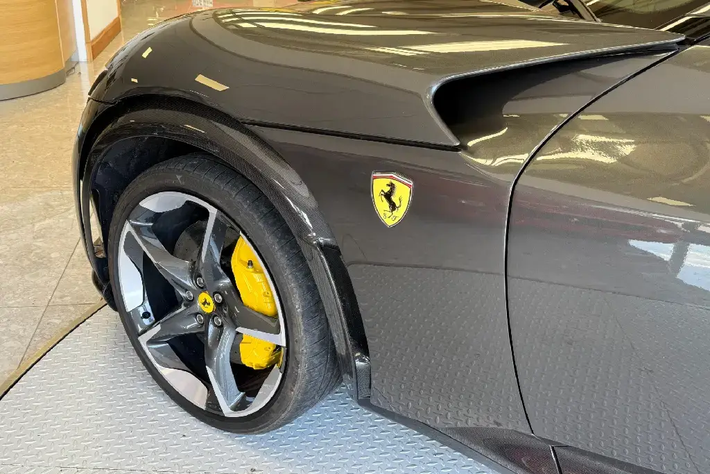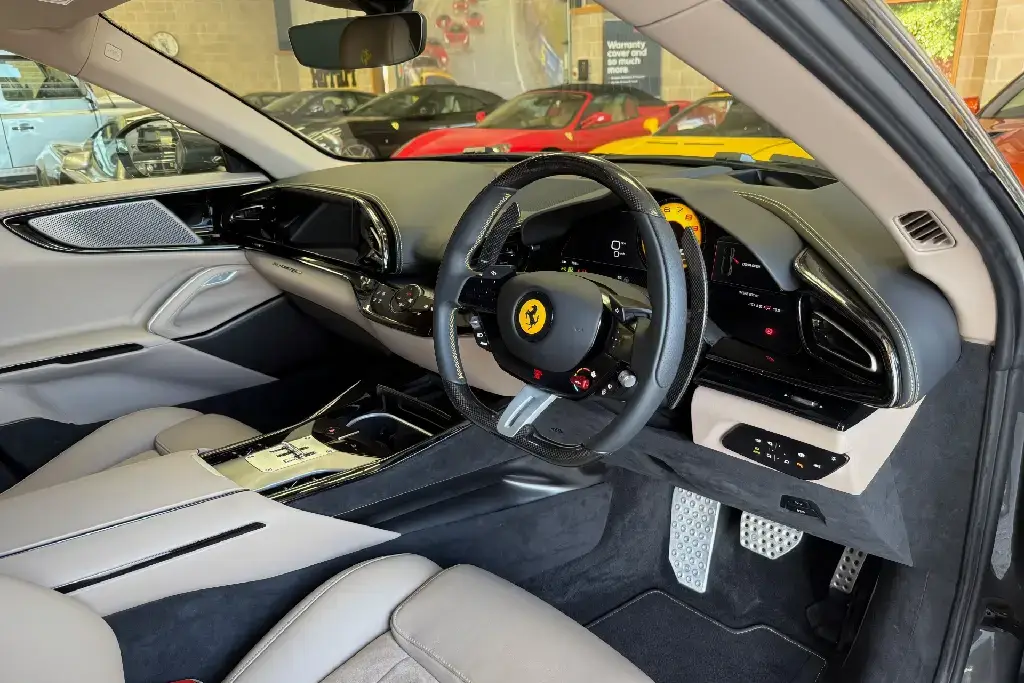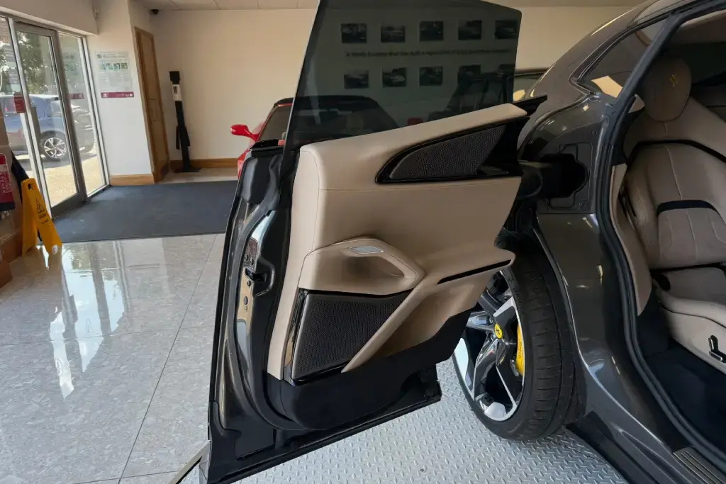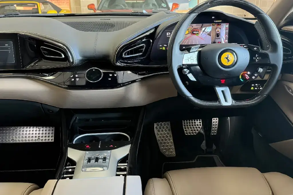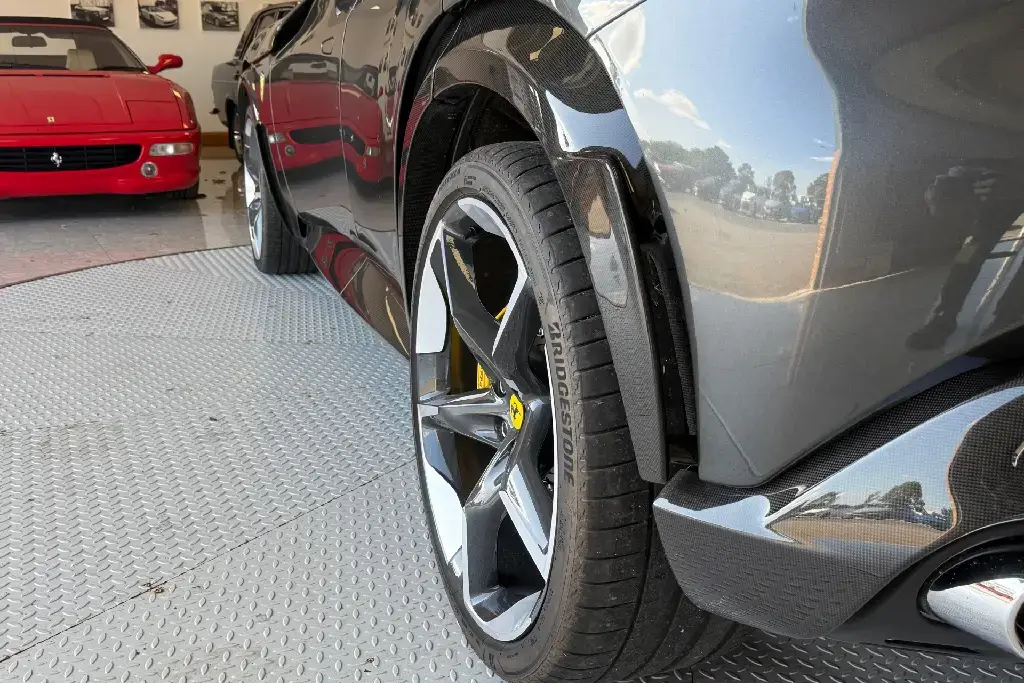 Features Include – 22-23in Alloy Wheels – Forged – Glossy Liquid, Giallo Modena Brake Callipers, Glossy Carbon Fibre Rear Diffuser, Glossy Carbon Fibre Front Spoiler, Glossy Carbon Fibre Underdoor Cover, Panoramic Roof, Privacy Laminated Windows, Wheel Arches in Glossy Carbon, Alcantara – Tortora, Carbon Fibre Instrument Cluster, Embroidered Prancing Horse on Headrests, Floor Mats with Embroidered Logo, Glossy Carbon Fibre Steering Wheel with LEDs, Leather – Tortora, Front Suspension Lifter, Yellow Rev Counter, Driver Memory Seats, Heads Up Display, Standard Features – 10.2in Passenger Display, 16in Full Digital Display Instrument Cluster, ABS EVO – Anti-Lock Braking System, Adaptive Cruise Control – Automatic Emergency Brake – Lane Departure Warning – Lane Keep Assist with Blind Spot Detection, Adaptive Front Headlights, Air Quality Sensors, Airbag – Side, Automatic Rear Doors, CCM4 – Carbon Ceramic Brake System, E-Diff 3 with SSC Integration, EPS – Dynamic Electronic Power Steering, Electric Windows – Front, Electrochromic Heated Side Mirrors with Automatic Closure, Ferrari Active Suspension System, Four Soft Close Doors, Four Zone Air Conditioning System, Front and Rear Parking Sensors, Full Electric Seats, Full Matrix-LED Headlights, High-End Audio System, ISOFIX for Rear Seats, Key with Transponder – Integrated Anti-Theft Alarm and Remote Control for Opening Doors and Tailgate, Keyless Engine Start System, Rain and Light Sensors, Rear Parking Camera, SSC – Side Slip Control 8.0, Smartphone Interface, Surround View, TPTMS – Tyre Pressure and Temperature Monitoring System, Traction Control F1 with SSC Integration, Trunk Kit, Two Dual-Stage Front Airbags, Tyre Repair Kit, Vehicle Dynamics Control – Manettino with 5 Settings – Wet – Comfort – Sport – Race – ESC OFF, Wireless Smartphone Charger.