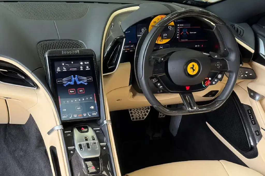 Features Include – 20in Alloy Wheels – Forged Diamond Rims, Yellow Brake Callipers, Nero Stitching, Black Tailoring Fabric Hood, Embroidered Car Logo on Headrest, Embroidered Logo on Headrest, Embroidered Prancing Horse on Headrests, Glossy Carbon Fibre Dashboard Inserts, Glossy Carbon Fibre Steering Wheel with LEDs, Glossy Carbon Fibre Upper Tunnel Trim, Leather – Crema, Ventilated Full Electric Front Seats, Magneride Dual Mode Suspension, Gloss Black Sills, Gloss Black Front Splitter, Gloss Black Rear Diffuser, Daytona Style Seats, Standard Features – 16in Full Digital Display Instrument Cluster, ABS and EBD – Performance Anti-Lock Braking Systems with Electronic Brakeforce Distribution, Adaptive Cruise Control – ACC, Anti-Theft System, Battery Maintainer, CCM3 – Carbon-Ceramic Brake System, Car Protection Cover, Dual Zone Automatic Air Conditioning System, E-Diff – 3rd Generation, EPS – Electronic Power Steering, ESC – Electronic Stability Control, Electric Heated Side Mirrors with Automatic Closure, Electric System for Technical Fabric Capote, Electric Windows – Front, Engine Start Touch-Button on Steering Wheel, F1-Trac – Traction Control System, Ferrari Dynamic Enhancer, Front Airbags for Driver and Passenger, Front and Rear Parking Sensors, Full Electric Seats, Full LED Headlights, Infotelematic System with Maps Navigation – USB Plug on Central Tunnel – 8.4in Touch-Screen – Bluetooth Audio Streaming – DAB Radio, Keyless Entry and Engine Start system, LED Tail Lights, Lane Keeping Assist – LKA, Performance Launch Control, Pirelli Tyres, Rain and Light Sensors, Side Airbags on Door Panel for Head Protection, Smartphone Interface, Traffic Sign Recognition – TSR, Tyre Repair Kit, Vehicle Dynamics Control – Manettino with 5 Settings – Wet – Comfort – Sport – Race – ESC OFF, Wind Deflector Integrated Rear Backrest, Wireless Smartphone Charger.