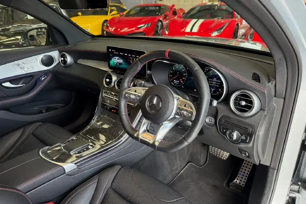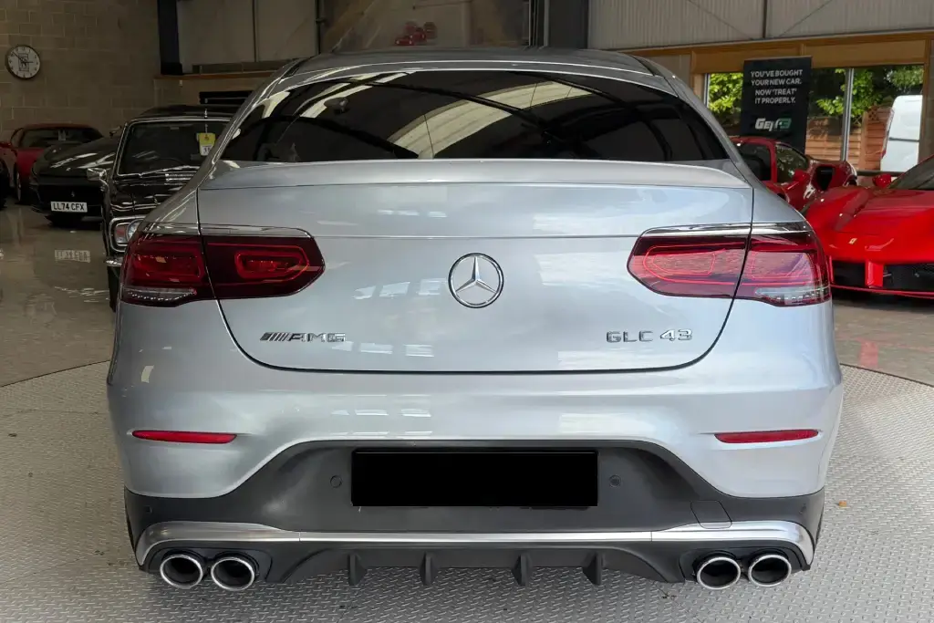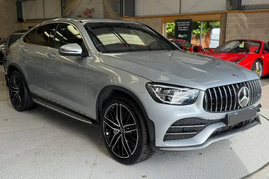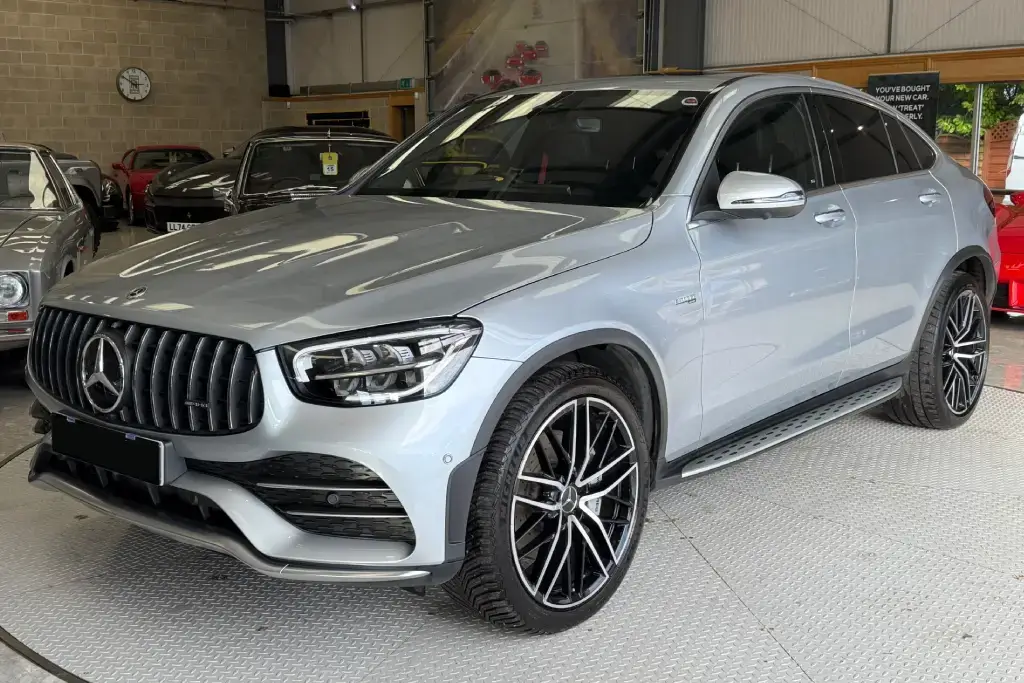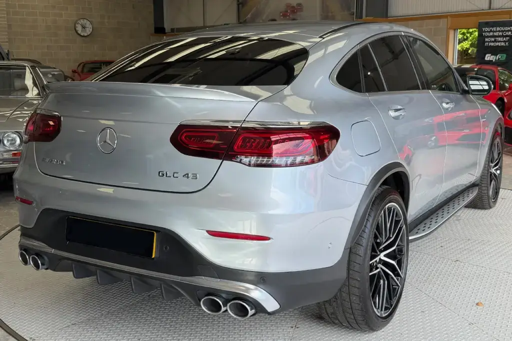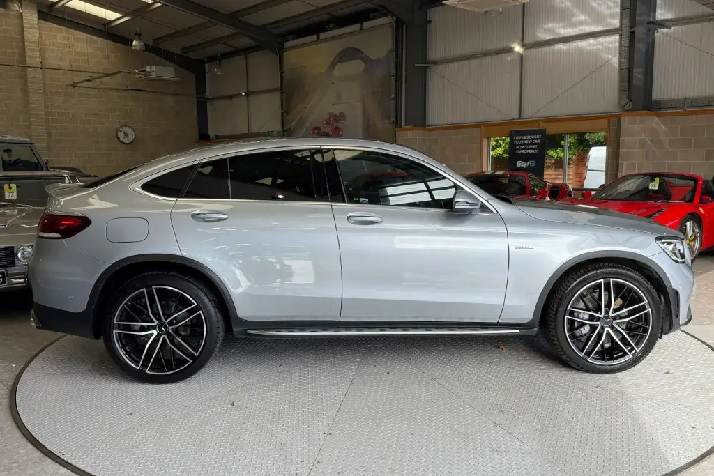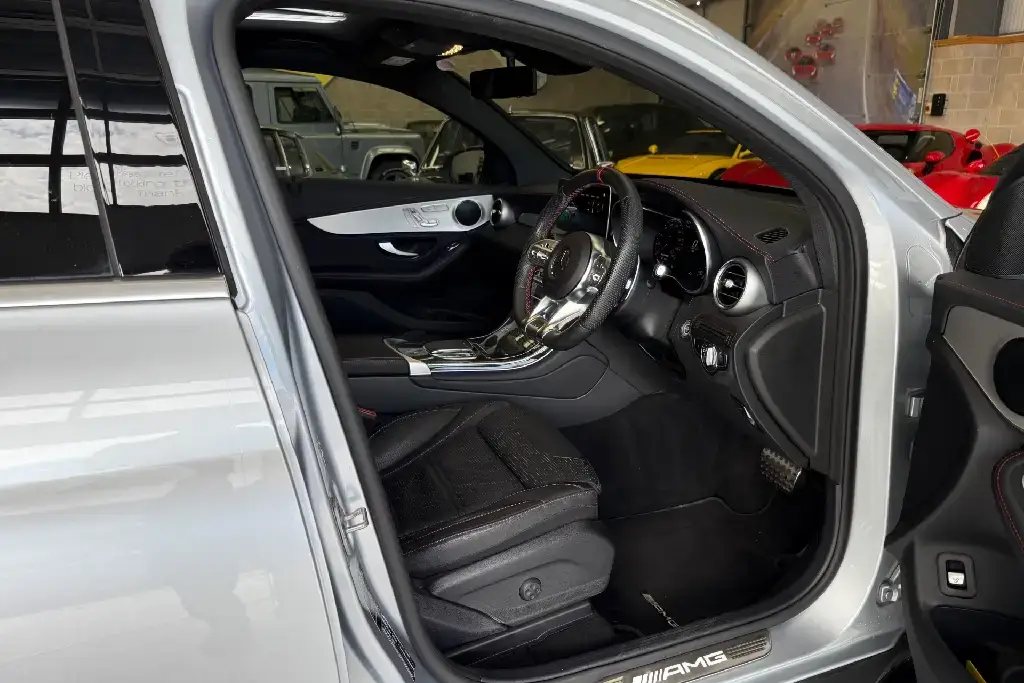 2023 73 Mercedes-Benz GLC 3.0 GLC43 V6 AMG (Premium Plus) Coupe G-Tronic+ 4MATIC Euro 6 (s/s) 5dr finished in Iridium Silver Metallic accompanied by Black Leather Upholstery.